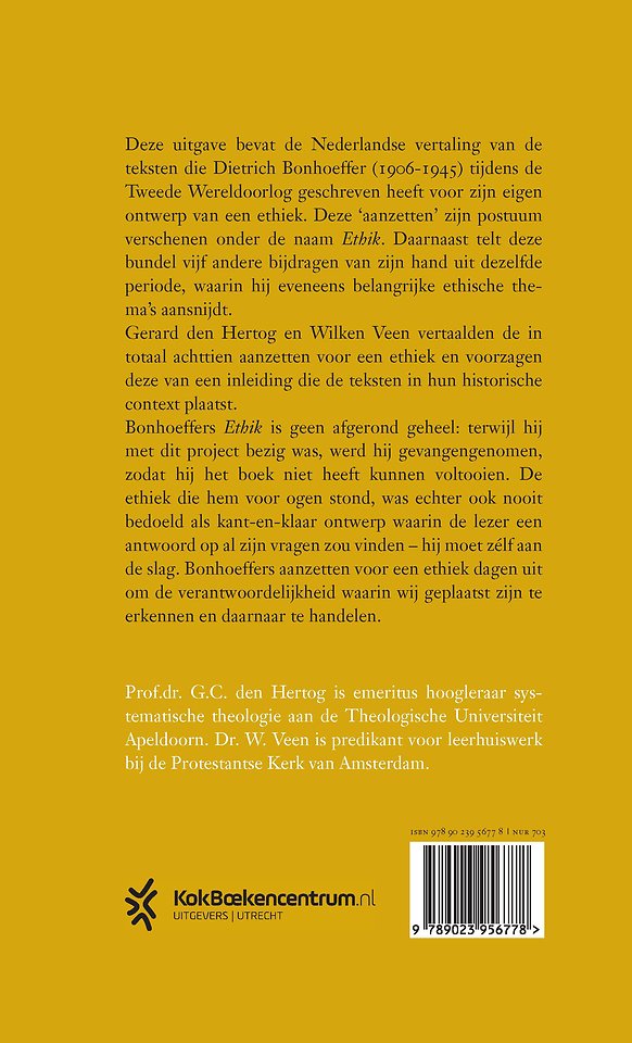 Dietrich Bonhoeffer (1906-1945) werkte tijdens de Tweede Wereldoorlog aan zijn eigen ontwerp van een ethiek. Het project bleef onvoltooid, doordat hij gevangengenomen werd. De ethiek die hem voor ogen stond, was echter ook nooit bedoeld als kant-en-klaar ontwerp waarin de lezer een antwoord op al zijn vragen zou vinden – hij moet zélf aan de slag. Bonhoeffers aanzetten voor een ethiek dagen de lezer daartoe uit. De teksten zijn vertaald en ingeleid door Gerard den Hertog en Wilken Veen.