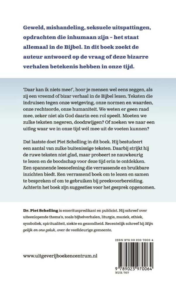 Dat laatste doet Piet Schelling in dit boek. Hij bestudeert een aantal van zulke buitenissige teksten. Daarbij strijkt hij de ruwe teksten niet glad, maar probeert ze nauwkeurig te lezen en de boodschap voor deze tijd erin te ontdekken. Een spannende leesoefening die verrassende en bruikbare inzichten biedt. Een verrassend boek om te lezen en samen te bespreken of om te gebruiken bij preekvoorbereiding. Achterin het boek zijn suggesties voor het gesprek opgenomen.