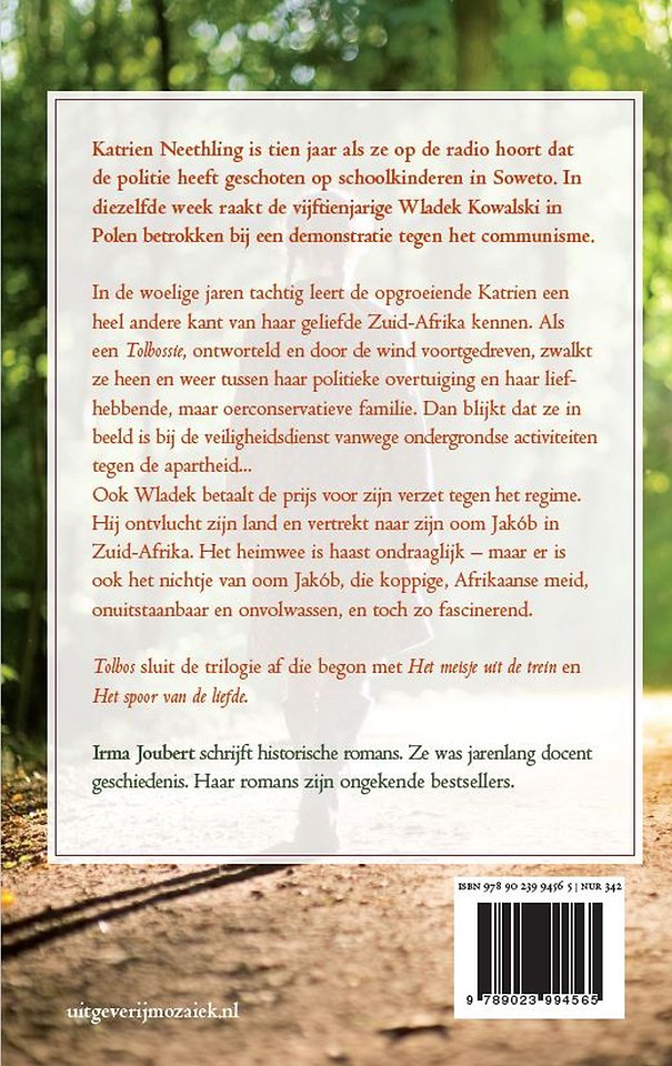 De tienjarige Katrien Neethling hoort op de radio dat de politie heeft geschoten op de betogende schoolkinderen van Soweto. In diezelfde week raakt de vijftienjarige Wladek Kowalski in Polen betrokken bij een demonstratie tegen het communisme. In de woelige jaren tachtig leert de opgroeiende Katrien een heel andere kant van haar geliefde Zuid- Afrika kennen. Als een Tolbossie, ontworteld en door de wind voortgedreven, zwalkt ze heen en weer tussen haar politieke overtuiging en haar liefhebbende, maar oerconservatieve familie. Dan blijkt dat ze in beeld is bij veiligheidsdienst vanwege ondergrondse activiteiten tegen de apartheid... Ook Wladek betaalt de prijs voor zijn verzet tegen het regime. Hij vertrekt naar zijn oom Jakób in Zuid-Afrika om daar een nieuw leven op te bouwen. Het heimwee is haast ondraaglijk maar er is ook het nichtje van oom Jakób, die koppige, Afrikaanse meid, onuitstaanbaar en onvolwassen, en toch zo fascinerend. Hoewel ze in politiek opzicht lijnrecht tegenover elkaar staan, herkennen Katrien en Wladek in elkaar de vurige betrokkenheid bij een revolutie tegen de gevestigde orde. Uiteindelijk triomfeert het menselijk hart.