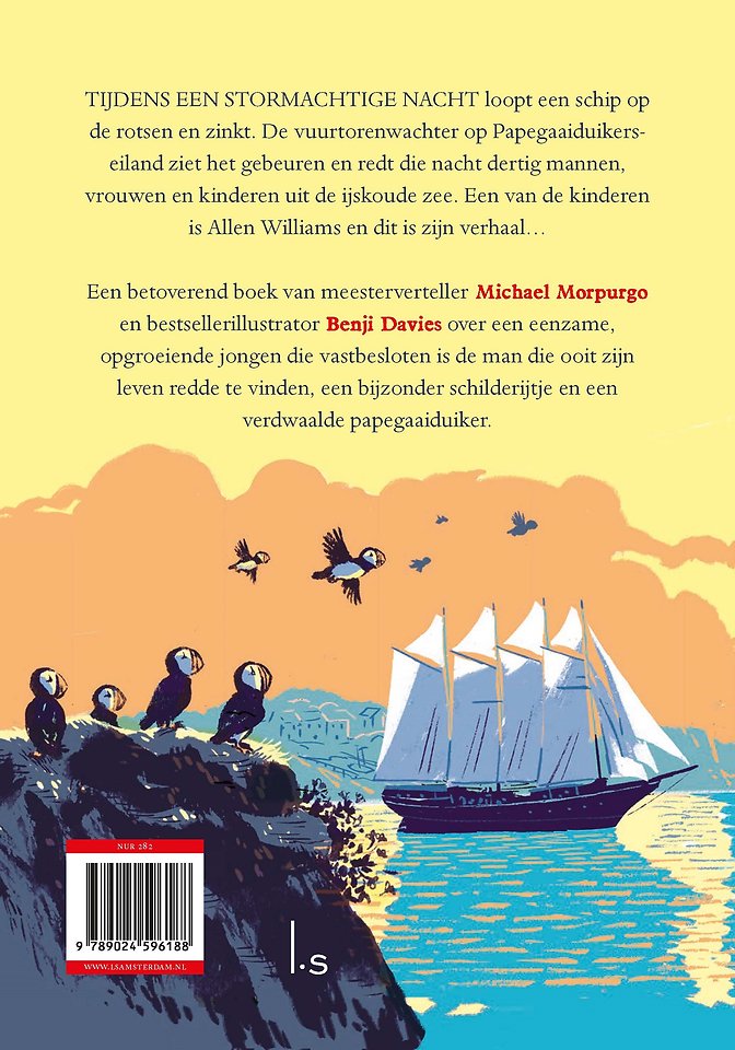 De jongen en de papegaaiduiker van auteur Michael Morpurgo (o.a. War Horse) en illustrator Benji Davies (o.a. De kleine walvis) is een ontroerend en sfeervol verhaal voor jong en oud over een eenzame jongen en een vuurtorenwachter.