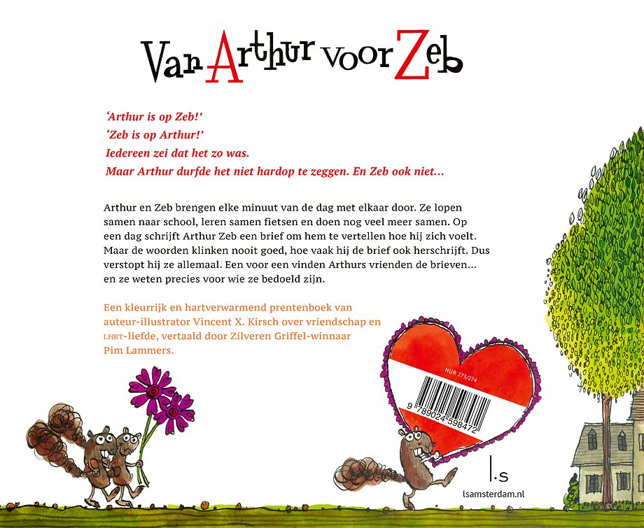 In het kleurrijke prentenboek Van Arthur voor Zeb vertelt auteur-illustrator Vincent X. Kirsch op subtiele en hartverwarmende manier een verhaal over vriendschap en liefde. Wat dit boek bijzonder maakt is de ongedwongen manier waarop die liefde, die toevallig tussen twee jongens is, wordt verbeeld voor kinderen vanaf 5 jaar.