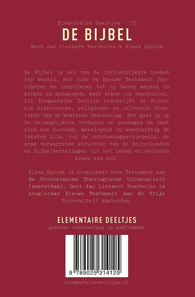 Dit Elementaire Deeltje beschrijft de Bijbel als een historische, religieuze en culturele brontekst van de westerse beschaving. Het gaat in op de ontstaansgeschiedenis, op de soms verwarrende structuur van de Bijbelboeken en op Bijbelvertalingen uit het heden en verleden. Het behandelt de belangrijkste verhalen en passages en laat zien hoe boeiend, meeslepend en weerbarstig de teksten zijn.