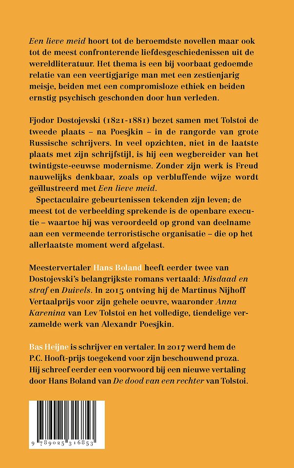 Fjodor Dostojevski (1821-1881) bezet samen met Tolstoi de tweede plaats – na Poesjkin – in de rangorde van grote Russische schrijvers. In veel opzichten, niet in de laatste plaats met zijn schrijfstijl, is hij een wegbereider van het twintigste-eeuwse modernisme. Zonder zijn werk is Freud nauwelijks denkbaar, zoals op verbluffende wijze wordt geïllustreerd met Een lieve meid. Spectaculaire gebeurtenissen tekenden zijn leven; de meest tot de verbeelding sprekende is de openbare executie – waartoe hij was veroordeeld op grond van deelname aan een vermeende terroristische organisatie – die op het allerlaatste moment werd afgelast.