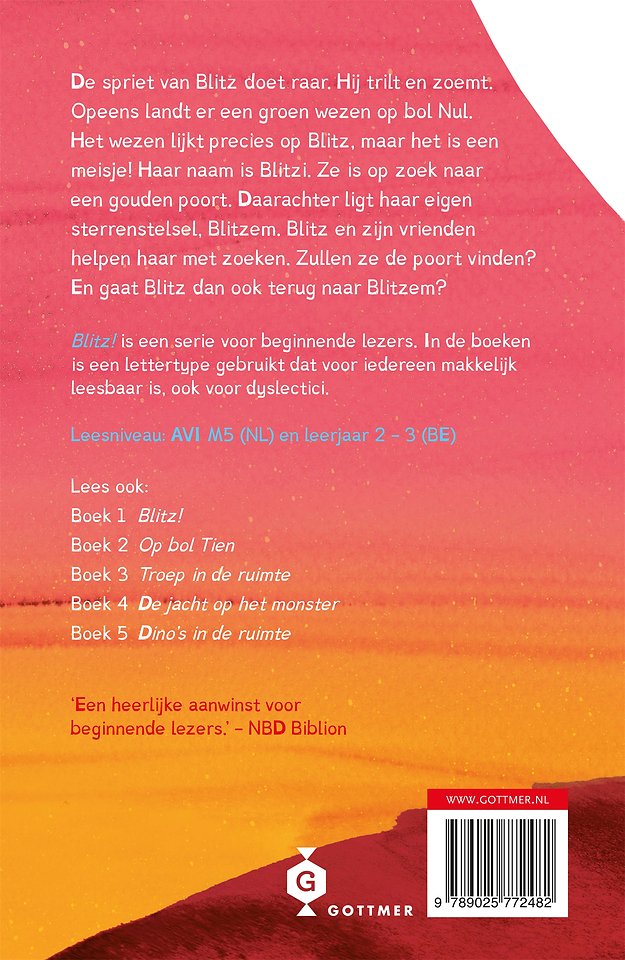 Het lijkt eenvoudig, maar ga er maar aan staan: een spannend verhaal schrijven voor kinderen die net zijn begonnen aan hun leescarrière. Rian Visser verstaat die kunst! 'Blitz! De gouden poort' voldoet aan alle normen voor een eerste leesboek: grote letters, een lettertype dat ook voor dyslectici makkelijk leesbaar is, makkelijke woorden, korte zinnen die steeds op een nieuwe regel beginnen, beknopte hoofdstukjes en veel grappige illustraties van Lars Deltrap. Gelukkig zijn er nog veel meer boeken in de 'Blitz!'-serie!