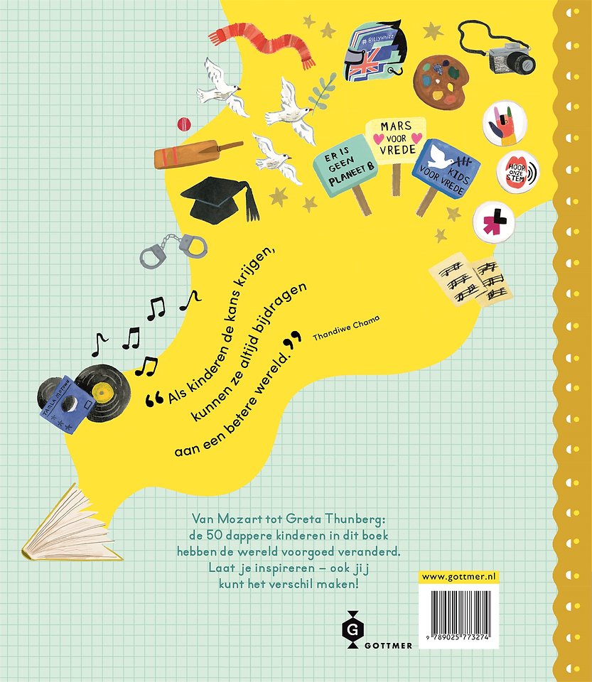 In 'Wereldkinderen' ontmoet je 50 kinderen en jongeren van over de hele wereld. Met hun passie, lef en creativiteit hebben ze elk een belangrijke culturele, politieke of sociale verandering in gang gezet. Van Louis Braille tot Greta Thunberg, van Pocahontas tot Mozart en van Emma Watson tot onze eigen Anne Frank: allemaal laten ze zien dat je absoluut niet volwassen hoeft te zijn om de wereld te veranderen. Daarmee is 'Wereldkinderen' een prachtig boek voor alle betrokken kinderen van nu.