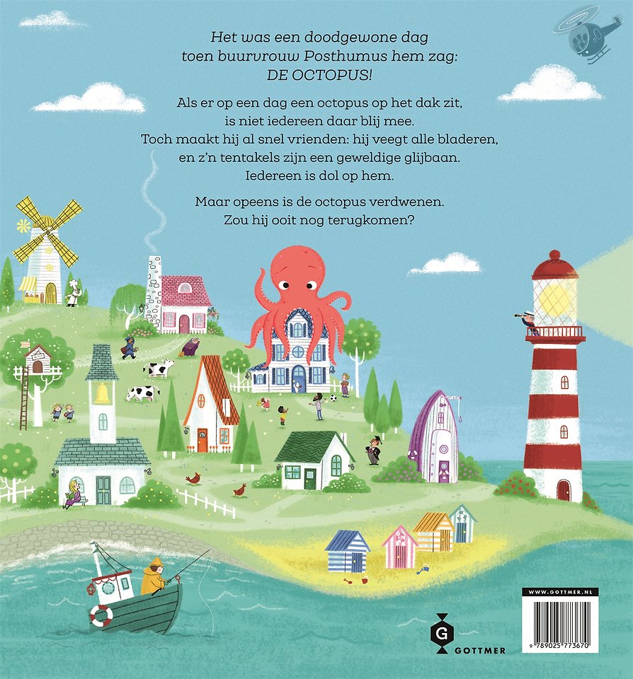 'Onze octopus' is een vrolijk prentenboek van Peter Bently en Steven Lenton, op rijm vertaald door Gouden Griffel-winnaar Bette Westera. In 'Onze octopus' gebeurt er iets heel bijzonders. Op een doodgewone dag ziet de buurvrouw ineens iets raars op het dak: een enorme, oogverblindende, neon roze octopus! Eerst probeert de brandweer hem van het dak af te spuiten, maar dan blijkt dat het eigenlijk heel handig en gezellig is om een octopus op je dak te hebben. Met zijn acht tentakels is hij een geweldige voetballer, helpt hij met de was en het zoeken van kwijtgeraakte spullen, veegt hij blaadjes aan en... hij is een geweldige glijbaan. Alle buren worden jaloers, zij willen ook een octopus! Of een inktvis, dat is ook goed. 'Onze octopus' is een onverwacht, grappig en hartverwarmend prentenboek over het verwelkomen van vreemdelingen en nieuwelingen - ze zouden je leven zomaar eens beter kunnen maken!