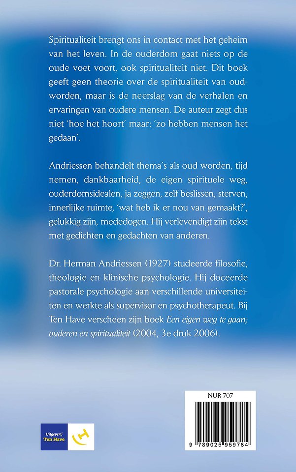 Spiritualiteit brengt ons in contact met het geheim van het leven. In de ouderdom gaat niets op de oude voet voort, ook spiritualiteit niet. Dit boek geeft geen theorie over de spiritualiteit van oudworden, maar is de neerslag van de verhalen en ervaringen van oudere mensen. De auteur zegt dus niet hoe het hoort, maar hoe andere mensen het hebben gedaan.