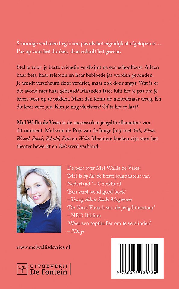 Mel Wallis de Vries is de succesvolste jeugdthrillerauteur van dit moment: tweemaal won zij de Prijs van de Jonge Jury. Haar boeken zijn razend populair; de verhalen zijn vlot, realistisch en altijd spannend tot de laatste bladzijde. Haar werk wordt in diverse landen uitgegeven.