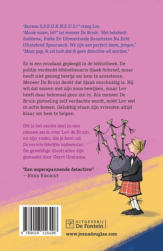 Dit is het eerste deel in de serie Bureau Speurneus, over Lev de Bruin en zijn vader. Die ken je nog uit De verschrikkelijke badmeester. Voor dat boek ontving Jozua Douglas de Hotze de Roos-prijs. De humoristische illustraties in Bureau S.P.E.U.R.N.E.U.S. en de boekenmaffia zijn gemaakt door Geert Gratama.