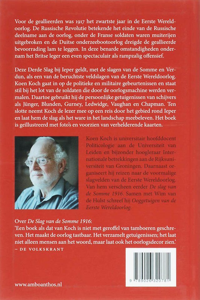 Deze Derde Slag bij Ieper geldt, met de slagen van de Somme en Verdun, als een van de beruchtste veldslagen van de Eerste Wereldoorlog. Koen Koch gaat in op de Politieke en militaire gebeurtenissen en staat stil bij het lot van de soldaten die door de oorlogsmachine werden vermalen. Daartoe gebruikt hij de persoonlijke getuigenissen van schijvers als Jünger, Blunden, Gurney, Ledwidge,Vaughan en Chapman, Ten slotte neemt Koch de lezer mee op een reis door het gebied rond Ieper en laat hem de slag als het ware in het ;landschap meebeleven. Het boek os geïllusreerd met foto's en voorzien van verhelderende kaarten.