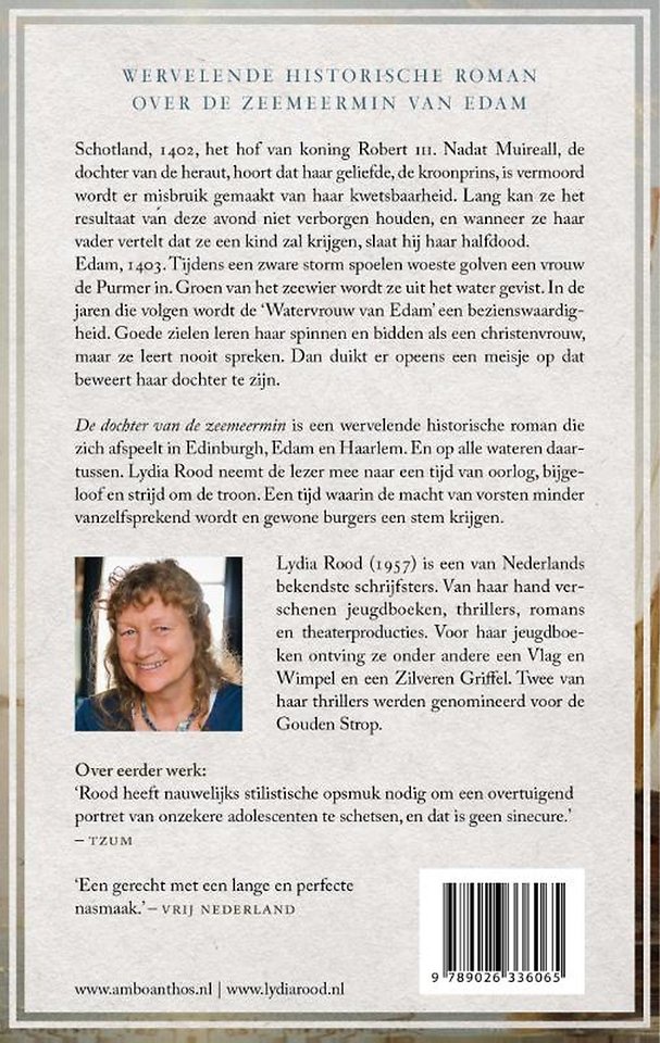 Edam, 1403. Tijdens een zware storm drijven woeste golven een vrouw het Purmermeer in. Groen van het zeewier wordt ze eruit gevist. In de jaren die volgen wordt de 'Watervrouw van Edam' een bezienswaardigheid. Goede zielen leren haar spinnen en bidden als een christenvrouw, maar de mensentaal leert ze nooit. Dan duikt er opeens een meisje uit Schotland op dat beweert haar dochter te zijn. Lydia Rood neemt de lezer in 'De dochter van de zeemeermin' mee naar de Middeleeuwen: een tijd van oorlog, bijgeloof en van strijd om de troon.