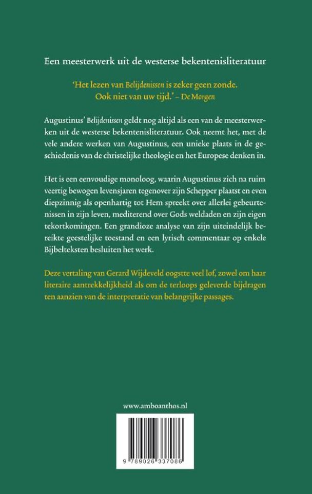 Deze vertaling van Gerard Wijdeveld vond veel waardering, zowel om haar literaire aantrekkelijkheid als om de terloops geleverde bijdragen ten aanzien van interpunctie en interpretatie van belangrijke passages. AURELIUS AUGUSTINUS (354-430) was theoloog, filosoof, bisschop van Hippo en geldt als een van de belangrijkste kerkvaders.
