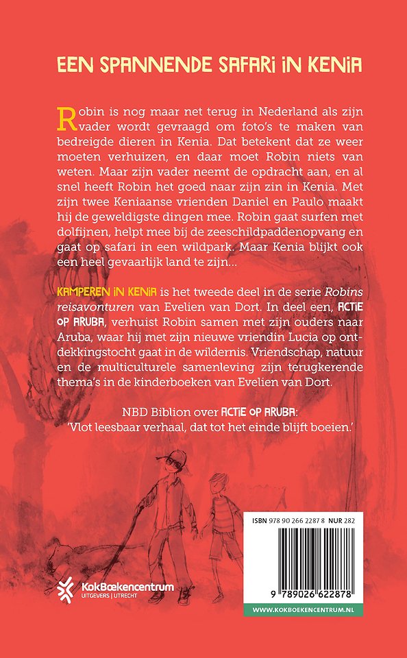 In ‘Kamperen in Kenia’ van Evelien van Dort gaat Robin op safari in Kenia. Zijn ouders moeten daar een paar maanden gaan werken. Robin vindt dat helemaal niet leuk, hij kan zijn vrienden en vooral Anne niet missen. De reis verloopt heel anders dan hij verwacht. Robin heeft een supertijd in Kenia: hij helpt bij de opvang van zeeschildpadden, surft met dolfijnen en gaat met zijn vriend Paulo kamperen in een wildpark. Vita, de huishond wordt zijn allergrootste vriend. Zonder Vita wil Robin zelfs niet meer weg uit Kenia. Mag hij de hond houden? Eerder verscheen in de serie ‘Robins reisavonturen’ het boek ‘Actie op Aruba’. De illustraties van Els van Egeraat maken het lezen nog leuker.