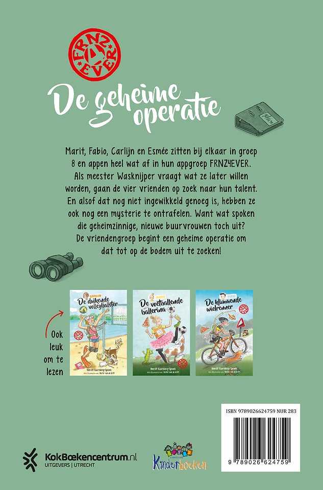 Marit, Fabio, Carlijn en Esmée vormen al jarenlang een hechte vriendengroep. Ze zitten bij elkaar in groep 8 en appen heel wat af in hun appgroep FRNZ4EVER. In dit nieuwe, zelfstandig te lezen deel van de serie gaan de vier vrienden op zoek naar hun talent: wat willen ze later worden? En alsof dat nog niet ingewikkeld genoeg is, hebben ze ook nog een mysterie te ontrafelen. Want wat spoken die geheimzinnige, nieuwe buurvrouwen toch uit? De vriendengroep begint een geheime operatie om dat tot op de bodem uit te zoeken!