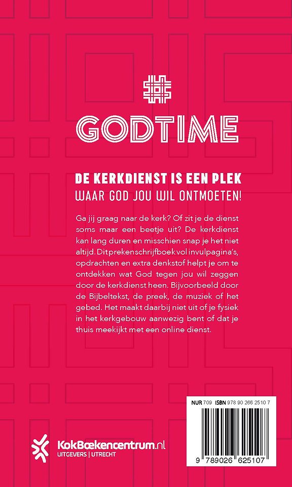 Hoe bid je? Waarom zingen we in de kerk? En hoe lees je de Bijbel? Deze vragen worden beantwoord in dit prekenschrijfboek. Veel tieners voelen zich vaak niet helemaal thuis of aangesproken in de kerk. Met ‘Godtime’ betrekt Corine Zonnenberg tieners bij de (online) kerkdienst. Met invulpagina’s, opdrachten en extra denkstof die tieners kunnen helpen in hun zoektocht naar God en de kerk.