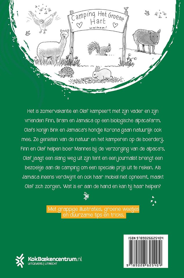 'Olaf scoort groen' is een groen kinderboek van Evelien van Dort. In de zomervakantie kampeert Olaf met zijn vader en zijn vriend Finn op de biobased alpacafarm. Er speelt zich heel wat af op de camping. Zo is er een snoezel-met-alpaca-arrangement, wat uiteindelijk stressverhogend in plaats van rustgevend blijkt te zijn, en komt een deelnemer niet meer terug van de survivaltocht. Olaf en Finn zijn bereid om boer Bas te helpen en treden op als camping guards. Dit blijkt niet zo eenvoudig te zijn als er problemen ontstaan onder de campinggasten. Zou het ze lukken om de orde te bewaren? Met grappige illustraties en toffe tips en tricks voor thuis en in de klas. Lees ook 'Olaf en de groende challenge'.
