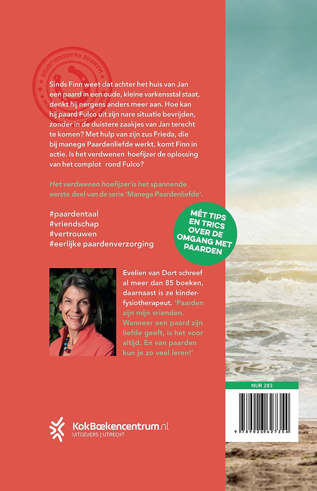 ‘Het verdwenen hoefijzer’ van Evelien van Dort is het eerste deel uit de serie ‘Manege Paard Eerlijk’ voor jongens en meisjes vanaf 10 jaar, over een jongen die een verwaarloosd paard redt met hulp van zijn familie en vrienden. Sinds Finn weet dat achter het huis van Jan een paard in een oude, kleine varkensstal staat, denkt hij nergens anders meer aan. Hoe kan hij paard Fulco uit zijn nare situatie bevrijden, zonder in de duistere zaakjes van Jan terecht te komen? Met hulp van zijn zus Frieda, die bij manege Paard Eerlijk werkt, komt Finn in actie. Is het verdwenen hoefijzer de oplossing van het complot rond Fulco? Een spannend verhaal over het opbouwen van (zelf-)vertrouwen en vriendschap met paarden. En met informatie, tips en trics over de omgang met paarden, paardentaal en een duurzame manier van paardenverzorging.