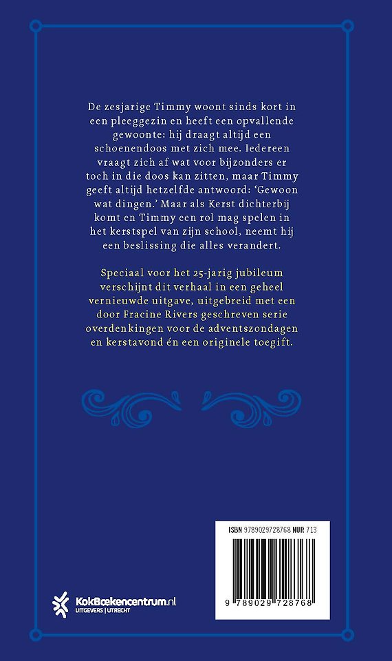 Francine Rivers is bekend van o.a. ‘Bevrijdende liefde’, ‘Mijn moeders hoop’ en ‘Het meesterwerk’. Ze schreef het verhaal over Timmy en zijn schoenendoos bijna tien jaar nadat ze tot geloof kwam, geïnspireerd door haar eigen moeite om haar zorgen en dank bij God neer te leggen.