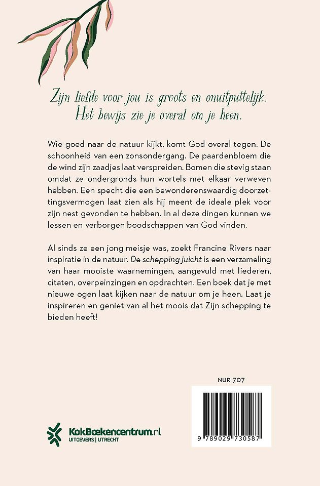 In De schepping juicht neemt bestsellerauteur Francine Rivers je mee de natuur in en laat ze je zien dat, als je goed kijkt, je daar overal God tegenkomt. Of je nu natuurliefhebber bent of niet, dit boek laat je met nieuwe ogen kijken naar de natuur om je heen. De schoonheid van een zonsondergang. De paardenbloem die de wind zijn zaadjes laat verspreiden. Bomen die stevig staan omdat ze ondergronds hun wortels met elkaar verweven hebben. Een specht die een bewonderenswaardig doorzettingsvermogen laat zien als hij meent de ideale plek voorzijn nest gevonden te hebben. In al deze dingen kunnen we lessen en verborgen boodschappen van God vinden. Al sinds ze een jong meisje was, zoekt Francine Rivers naar inspiratie in de natuur. De schepping juicht is een verzameling van haar mooiste waarnemingen, aangevuld met christelijke liederen, citaten, overpeinzingen en opdrachten. Zijn liefde voor jou is groots en onuitputtelijk. Het bewijs zie je overal om je heen. Laat je inspireren, trek je wandelschoenen aan en geniet van al het moois dat Zijn schepping te bieden heeft!