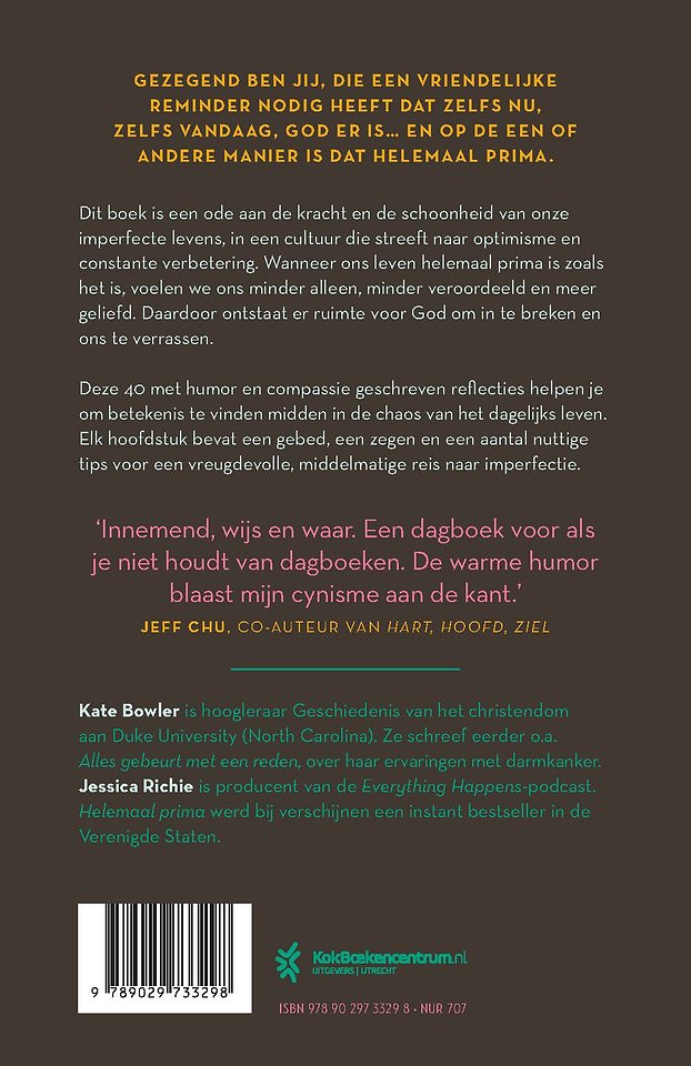 Helemaal prima van Kate Bowler is een prikkelende bundel reflecties over de kracht en de schoonheid van onze verre van perfecte levens. Door onze onvolmaaktheid te omarmen, creëren we een leven waarin we ons niet langer van de wijs laten brengen door social media, waarin we genieten van onze afhankelijkheid van anderen en waarin God inbreekt en ons verrast. Het boek is opgebouwd uit zo’n veertig sublieme en met humor geschreven reflecties, elk gevolgd door een zegen voor de lezer en praktische tips.