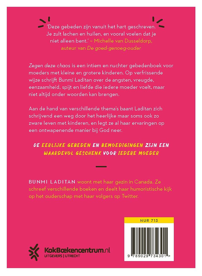 In ‘Zegen deze chaos’, een gebedenboek voor moeders, deelt de Amerikaanse bestsellerauteur en twitterlieveling Bunmi Laditan op een verfrissende manier de gebeden voor haar kinderen. Haar herkenbare, eerlijke en hartverwarmende gebeden kunnen dienen als inspiratiebron voor het eigen gebedsleven. Ze beschrijft de angst, vreugde, eenzaamheid, spijt en liefde die elke moeder voelt, maar niet altijd onder woorden kan of durft te brengen. Er is geen gebed sterker dan het gebed van ouders voor hun kind. Dit boek laat zien hoe gebed het eigen leven kan veranderen, maar ook dat van het kind.