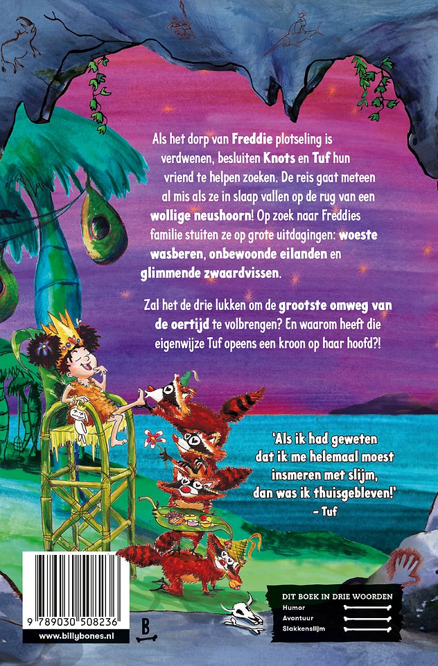 Als het dorp van Freddie plotseling is verdwenen, besluiten Knots en Tuf hun vriend te helpen zoeken. De reis gaat meteen al mis als ze in slaap vallen op de rug van een wollige neushoorn! Op zoek naar Freddies familie stuiten ze op grote uitdagingen: woeste wasberen, onbewoonde eilanden en glimmende zwaardvissen. Zal het de drie lukken om de grootste omweg van de oertijd te volbrengen? En waarom heeft die eigenwijze Tuf opeens een kroon op haar hoofd?!