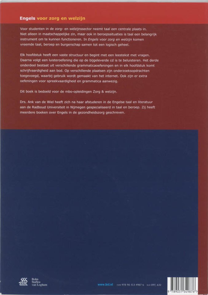 In dit boek komen vreemde taal, beroep en burgerschap samen tot een logisch geheel. Voor studenten in de zorg– en welzijnssector neemt taal een centrale plaats in. Niet alleen in maatschappelijke maar ook in beroepssituaties is taal een belangrijk instrument om te kunnen functioneren.In Engels voor zorg en welzijn heeft elk hoofdstuk een vaste structuur. Het begint met een leestekst met vragen. Daarna volgt een luisteroefening die op de bijgeleverde cd is te beluisteren. Het derde onderdeel bestaat uit verschillende grammaticaoefeningen en in de tweede helft van elk hoofdstuk komt de schrijfvaardigheid aan bod. Op verschillende plaatsen zijn onderzoeksopdrachten toegevoegd, waarbij gebruik wordt gemaakt van het internet. Ook zijn er extra oefeningen voor spreekvaardigheid en grammatica toegevoegd.