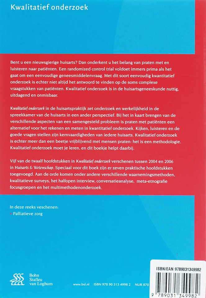 Kijken, luisteren en de goede vragen stellen zijn kemvaardigheden van iedere huisart. Kwalitatief onderzoek is echter meer dan een beetje vrijblijvend met mensen praten: het is een methodologie. Kwalitatief onderzoek moet je leren, en dit boekje helpt daarbij.Vijf van de twaalf hoofdstukken in Kwalitatief onderzoek verschenen tussen 2004 en 2006 in Huisart & Wetenschap. Speciaal voor dit boek zijn er zeven praktische hoofdstukken toegevoegd. Aan de rode komen onder andere verschillende waamemingsmethoden, kwalitatieve surveys, het halfopen interview, conversatieanalyse, meta-etnografie focusgroepen en het multimethodenonderzoek.Vijf van de twaalf hoofdstukken in Kwalitatief onderzoek verschenen tussen 2004 en 2006 in Huisart & Wetenschap. Speciaal voor dit boek zijn er zeven praktische hoofdstukken toegevoegd. Aan de rode komen onder andere verschillende waamemingsmethoden, kwalitatieve surveys, het halfopen interview, conversatieanalyse, meta-etnografie focusgroepen en het multimethodenonderzoek.In deze reeks veschenen:Palliatieve zorg
