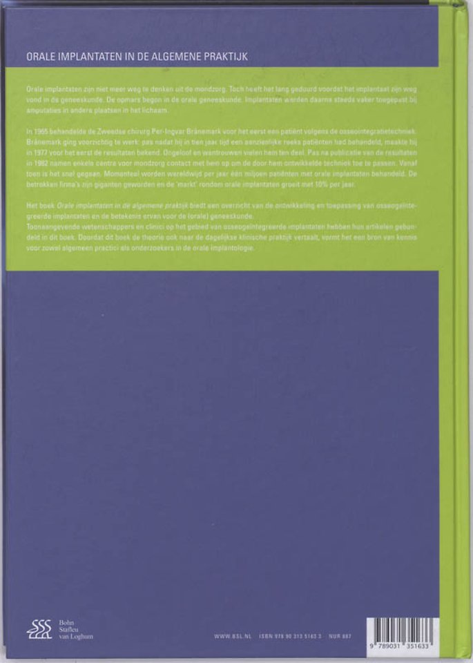Het boek Orale implantaten in de algemene praktijk biedt een overzicht van de ontwikkeling en toepassing van osseogeïntegreerde implantaten en de betekenis ervan voor de (orale) geneeskunde.