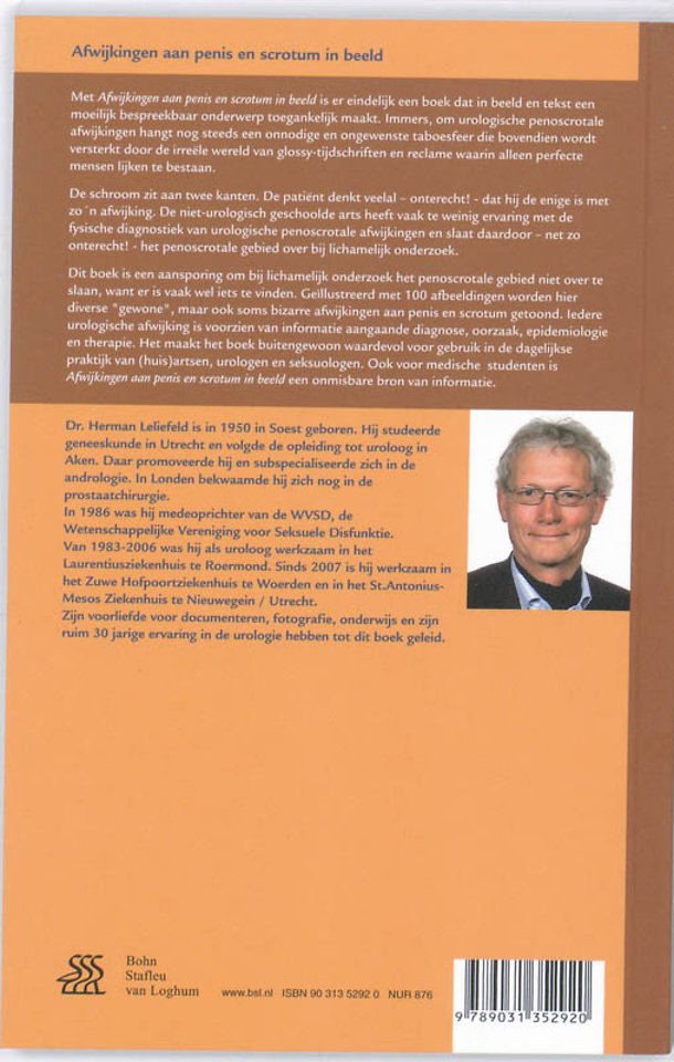 Met Afwijkingen aan penis en scrotum in beeld is er eindelijk een boek dat in beeld en tekst een moeilijk bespreekbaar onderwerp toegankelijk maakt. Immers, om urologische penoscrotale afwijkingen hangt nog steeds een onnodige en ongewenste taboesfeer die bovendien wordt versterkt door de irreële wereld van glossy-tijdschriften en reclame waarin alleen perfecte mensen lijken te bestaan. De schroom zit aan twee kanten. De patiënt denkt veelal - onterecht! - dat hij de enige is met zo´n afwijking. De niet-urologisch geschoolde arts heeft vaak te weinig ervaring met de fysische diagnostiek van urologische penoscrotale afwijkingen en slaat daardoor - net zo onterecht! - het penoscrotale gebied over bij lichamelijk onderzoek. Dit boek is een aansporing om bij lichamelijk onderzoek het penoscrotale gebied niet over te slaan, want er is vaak wel iets te vinden. Geïllustreerd met 100 afbeeldingen worden hier diverse "gewone", maar ook soms bizarre afwijkingen aan penis en scrotum getoond. Iedere urologische afwijking is voorzien van informatie aangaande diagnose, oorzaak, epidemiologie en therapie. Het maakt het boek buitengewoon waardevol voor gebruik in de dagelijkse praktijk van (huis)artsen, urologen en seksuologen. Ook voor studenten geneeskunde is dit boek een onmisbare bron van informatie.