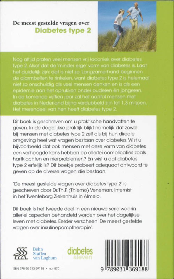 Dit boek is geschreven om u praktische handvaten te geven. In de dagelijkse praktijk blijkt namelijk dat zowel bij mensen met diabetes type 2 zelf als bij h un directe omgeving heel wat vragen bestaan over diabetes. Wist u bijvoorbeeld dat mensen met ook deze vorm van diabetes een verhoogde kans hebben op op allerlei complicaties zoals hartklachten en nierproblemen? En wist u dat diabetes type 2 erfelijk is? Dit boekje geeft antwoord op diverse vragen.De meest gestelde vragen over diabetes type 2 is het tweeede deel in een nieuwe serie waarin allerlei aspecten behandeld worden over het dagelijkse leven met diabetes. eerder verscheen al "De meest gestelde vragen over insulinepomptherpie".