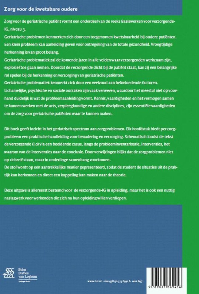 Dit boek geeft inzicht in het geriatrisch spectrum aan zorgproblemen. Elk hoofdstuk biedt per zorgprobleem een praktische handleiding voor benadering en verzorging. Schematisch loodst de tekst de verzorgende (i.o) via een beeldende casus, langs de probleeminventarisatie, interventies, het waarom van de interventies naar de conclusie. Door verwijzingen blijkt dat de zorgproblemen niet op zichzelf staan, maar in onderlinge samenhang voorkomen.De stof wordt op een aantrekkelijke manier gepresenteerd, zodat de student de situaties uit de praktijk kan herkennen en direct een koppeling kan maken naar de theorie.