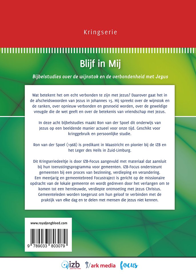 Wat betekent het om echt verbonden te zijn met Jezus? Daarover gaat het in de afscheidswoorden van Jezus in Johannes 15. Hij spreekt over de wijnstok en de ranken, over opnieuw verbonden worden en gesnoeid, over de geweldige vreugde die de wet geeft en over de betekenis van vriendschap met Jezus. In deze bijbelstudies maakt Ron van der Spoel dit diepe onderwijs van Jezus op een beeldende manier actueel voor onze tijd.
