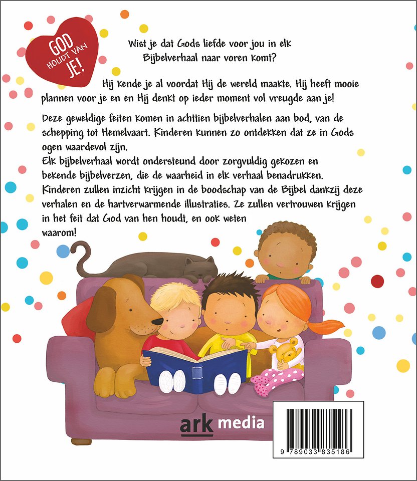 In God houdt van je! ontdekken kinderen dat ze in Gods ogen ongelooflijk waardevol zijn. Door middel van achttien bijbelverhalen leren kinderen ontdekken dat Gods liefde in elk bijbelverhaal naar voren komt, dat Hij ieder kind al kende voordat Hij de wereld maakte en dat Hij mooie plannen voor ze heeft! Elk bijbelverhaal wordt ondersteund door zorgvuldig gekozen en bekende bijbelverzen, die de waarheid in elk verhaal benadrukken.