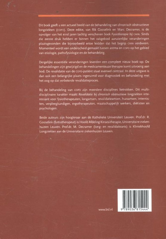 Beide auteurs zijn hoogleraar aan de Katholieke Universiteit Leuven. Prof.dr. R. Gosselink (fysiotherapeut) is hoofd van de afdeling Kinesitherapie aan de Universitaire ziekenhuizen Leuven. Prof.dr. M. Decramer (long- en revalidatiearts) is kliniekhoofd Longziekten aan de Universitaire ziekenhuizen Leuven.