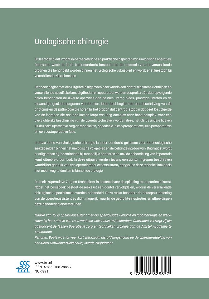 Dit leerboek geeft aankomende operatieassistenten een helder beeld van operatietechnieken binnen de urologische chirurgie. Ook geeft het achtergrondinformatie bij verschillende ziektebeelden. Daardoor is het ook zeer geschikt als naslagwerk voor andere beroepsgroepen in de gezondheidszorg.