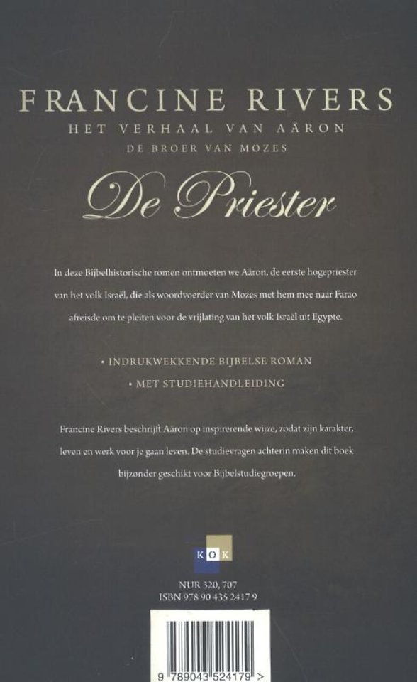 'De priester' van Francine Rivers is het eerste deel in een serie over mannen in de Bijbel die een belangrijke plaats innamen in de geschiedenis van Israël. Getrouw aan de feiten zoals die in de Bijbel zijn vermeld, brengt de schrijfster mannen van lang geleden tot leven en laat zij ze spreken op een bijdetijdse en inspirerende wijze.