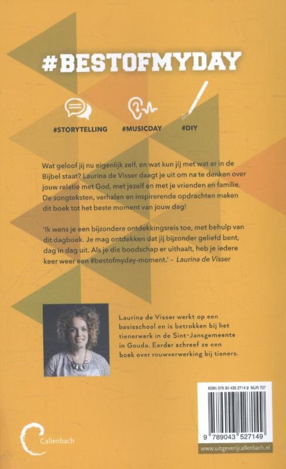 #BESTOFMYDAY is een vernieuwend en hip dagboek voor tienermeiden en jongens. Wat geloof jij nu eigenlijk en wat kun jij met wat er in de Bijbel staat? Laurina de Visser daagt jou uit om na te denken over jouw relatie met God, met jezelf en met je vrienden en familie. De songteksten, verhalen en korte teksten maken dit boek tot het beste moment van jouw dag!