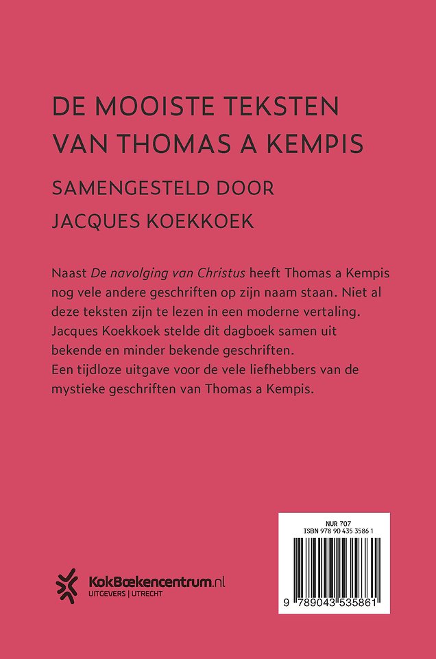 Het dagboek ‘Wandelen in het licht’ bevat de mooiste teksten van Thomas a Kempis. Naast De navolging van Christus liet Thomas a Kempis nog vele andere geschriften en traktaten als erfenis na. Niet al deze teksten zijn te lezen in een moderne vertaling. Jacques Koekkoek stelde dit dagboek samen uit de bekende geschriften en uit nog niet eerder gepubliceerde teksten. De teksten zijn uitnodigend opgemaakt en hebben elk een sprekend thematisch kopje. Een tijdloze uitgave voor de vele liefhebbers van de mystieke geschriften van Thomas a Kempis.