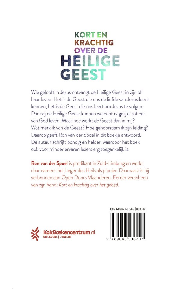 In ‘Kort en krachtig over de Heilige Geest’ geeft Ron van der Spoel in twaalf kernpunten weer wie de Heilige Geest is en wat Hij doet. Dit boek is ontstaan vanuit een persoonlijke zoektocht. De auteur heeft met vallen en opstaan ontdekt hoe ook zijn leven echt door Gods Geest geleid kan worden. Wie gelooft in Jezus ontvangt de Heilige Geest in zij n of haar leven. Het is de Geest die ons de liefde van Jezus leert kennen, het is de Geest die ons leert om Jezus te volgen. Maar hoe werkt de Geest dan in mij ? Hoe merk ik de Geest? Hoe gehoorzaam ik zijn leiding? Daarop geeft Ron van der Spoel in dit boek antwoord. De auteur schrijft bondig en helder, waardoor het boek ook voor minder ervaren lezers erg toegankelijk is.