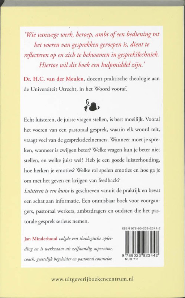 Luisteren is een kunst van Jan Minderhoud is een praktisch boek over het voeren van pastorale gesprekken. Echt luisteren, de juiste vragen stellen, is best moeilijk. Vooral het voeren van een pastoraal gesprek, waarin elk woord telt, vraagt veel van de gespreksdeelnemers. Wanneer moet je spreken, wanneer is zwijgen beter? Welke vragen kun je beter niet stellen, en welke juist wel? Heb je een goede luisterhouding, hoe herken je emoties? Welke rol spelen emoties en hoe ga je om met het geven en krijgen van feedback? Luisteren is een kunst is geschreven vanuit de praktijk en bevat een schat aan informatie. Een onmisbaar boek voor voorgangers, pastoraal werkers en andere ambtsdragers die het pastorale gesprek serieus nemen.
