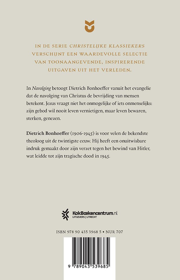 Bonhoeffer betoogt in 'Navolging' dat de navolging van Christus de bevrijding van mensen betekent. Bevrijding van alle menselijke instellingen en geboden, van al wat drukt en belast, van al wat zorg en gewetensbezwaren veroorzaakt. Het gebod van Jezus is hard voor wie er zich tegen verzet maar zacht voor wie er zich gewillig aan overgeeft. Navolging heeft dan ook niets te maken met krachtprestaties van de ziel. Dat is er dikwijls van gemaakt in een christendom waarin de genade een leerstuk was geworden, het geloof een systeem en het menselijk gedrag een kwestie was van gebod op gebod en regel op regel. Jezus vraag niet het onmogelijke of onmenselijke: zijn gebod wil nooit leven vernietigen maar leven bewaren, sterken, genezen. Navolging is een vreugde.