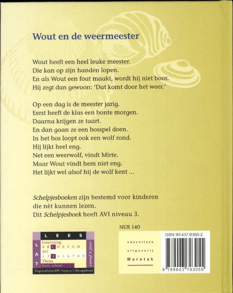 Wout heeft een heel leuke meester. Die kan op zijn handen lopen. En als Wout een fout maakt, wordt hij niet boos. Hij zegt dan gewoon: 'dat komt door het weer.' Op een dag is de meester jarig. Eerst heeft de klas een bonte morgen. Daarna krijgen ze taart. En dan gaan ze een bosspel doen. In het bos loopt ook een wolf rond. Hij lijkt heel eng. Net een weerwolf, vindt Mirte. Maar Wout vindt hem niet eng. Het lijkt wel alsof hij de wolf kent ...