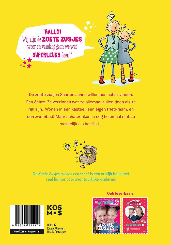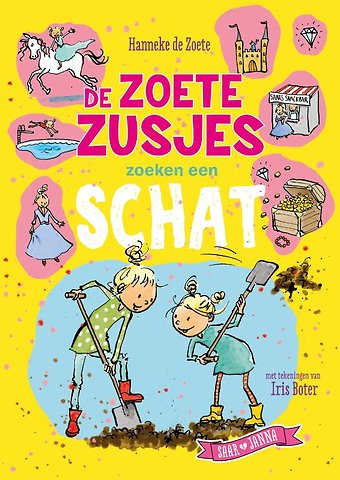 In 'De Zoete Zusjes zoeken een schat', geschreven door Hanneke de Zoete, gaan Saar en Janna op avontuur om een schat te vinden. Een échte. Ze zien het helemaal zitten, want terwijl ze aan het zoeken zijn bedenken ze wat ze allemaal zullen doen als ze rijk zijn. Wonen in een kasteel, een eigen frietkraam, en een zwembad! Maar schatzoeken is nog helemaal niet zo makkelijk als het lijkt…