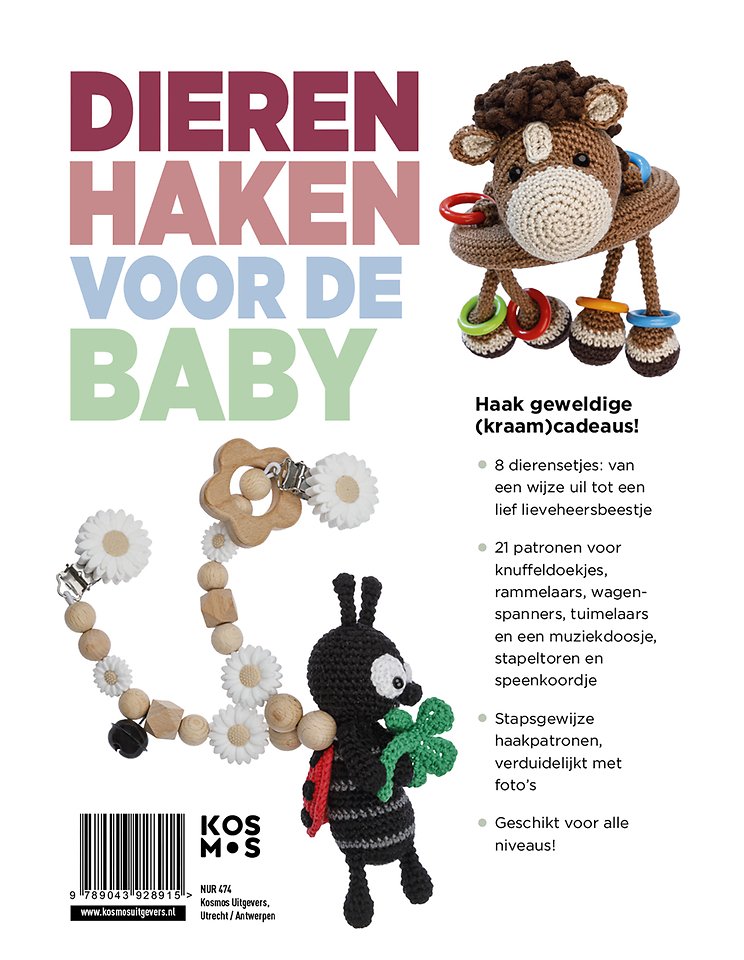 In ‘Dieren haken voor de baby’ vind je de allerleukste haakpatronen voor babyspeelgoed van Rosanne Briggeman. Haar duidelijke patronen en heldere uitleg maken het zelfs voor beginners mogelijk om de leukste rammelaars, knuffeldoekjes, wagenspanners en stapeltorens te haken.