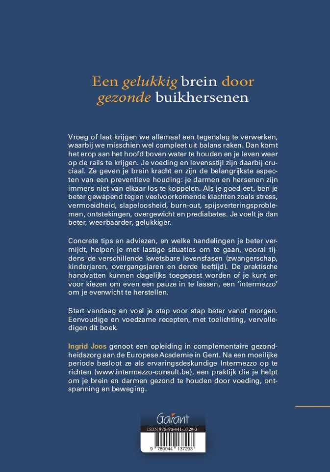 Ingrid Joos genoot een opleiding in complementaire gezondheidszorg aan de Europese Academie in Gent. Na een moeilijke periode besloot ze als ervaringsdeskundige Intermezzo op te richten (www.intermezzo-consult.be), een praktijk die je helpt om je brein en darmen gezond te houden door voeding, ontspanning en beweging.