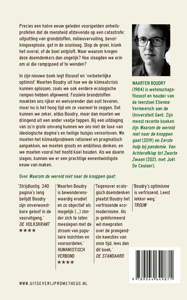 Bij een uitdaging van zo’n grote omvang kunnen we ons niet de luxe van ideologische dogma’s en heilige huisjes veroorloven. We moeten het klimaatprobleem rationeel en pragmatisch aanpakken, we moeten groots en ambitieus denken, en we moeten vooral het hoofd koel houden. Als we daarin slagen, kunnen we er een prachtige eenentwintigste eeuw van maken.