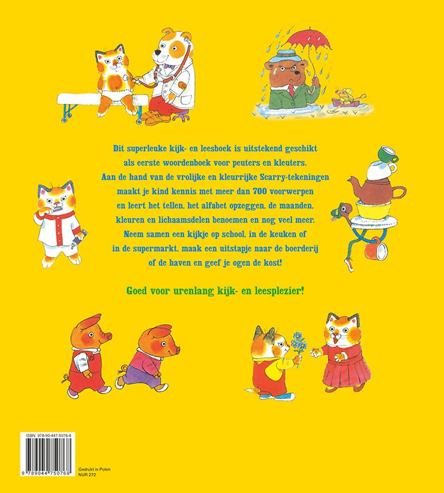 Dit superleuke kijk- en leesboek is uitstekend geschikt als eerste woordenboek voor peuters en kleuters. Aan de hand van vrolijke en kleurrijke Scarry-tekeningen maakt je kind kennis met meer dan 700 voorwerpen en leert het tellen, het alfabet opzeggen, de maanden, kleuren en lichaamsdelen benoemen en nog veel meer. Neem samen een kijkje op school, in de keuken of in de supermarkt, maak een uitstapje naar de boerderij of de haven en geef je ogen de kost! Goed voor urenlang kijk- en leesplezier!