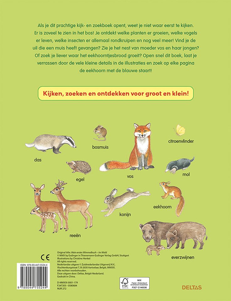 Als je dit prachtige kijk- en zoekboek opent, weet je niet waar eerst te kijken. Er is zoveel te zien in het bos! Je ontdekt welke planten er groeien, welke vogels er leven, welke insecten er allemaal rondkruipen en nog veel meer! Vind je de uil die een muis heeft gevangen? Zie je het nest van moeder vos en haar jongen? Of zoek je liever waar het eekhoorntjesbrood groeit? Open snel dit boek, laat je verrassen door de vele kleine details in de illustraties en zoek op elke pagina de eekhoorn met de blauwe staart!