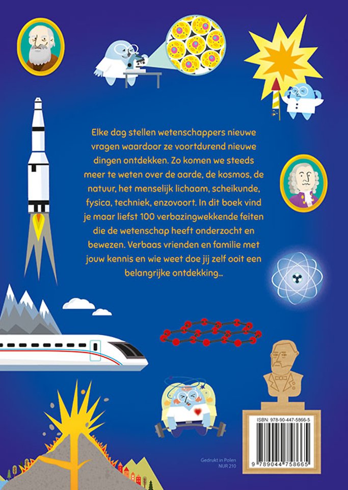 Elke dag stellen wetenschappers nieuwe vragen waardoor ze voortdurend nieuwe dingen ontdekken. Zo komen we steeds meer te weten over de aarde, de kosmos, de natuur, het menselijk lichaam, scheikunde, fysica, techniek, enzovoort. In dit boek vind je maar liefst 100 verbazingwekkende feiten die de wetenschap heeft onderzocht en bewezen. Verbaas vrienden en familie met jouw kennis en wie weet doe jij zelf ooit een belangrijke ontdekking…